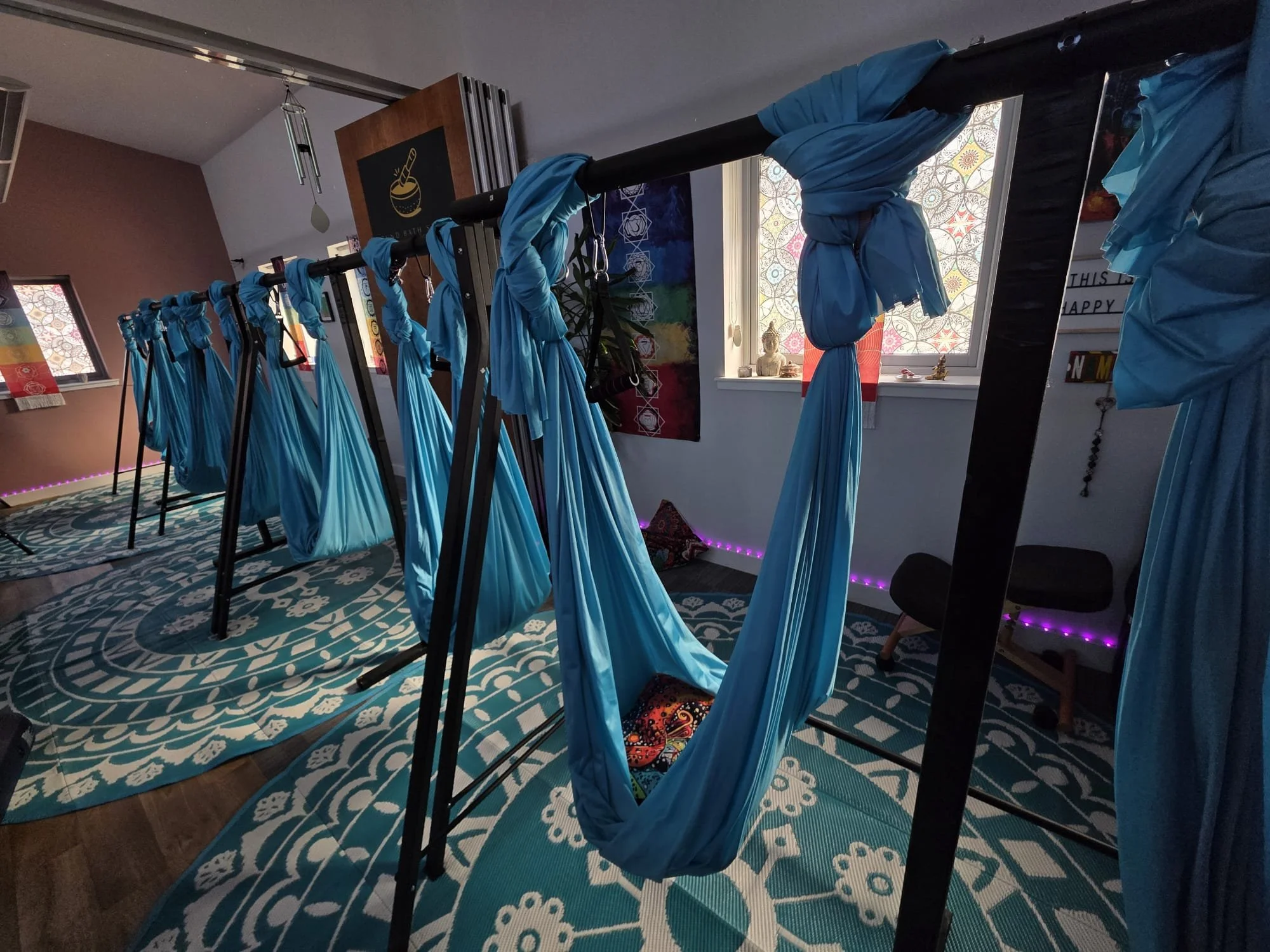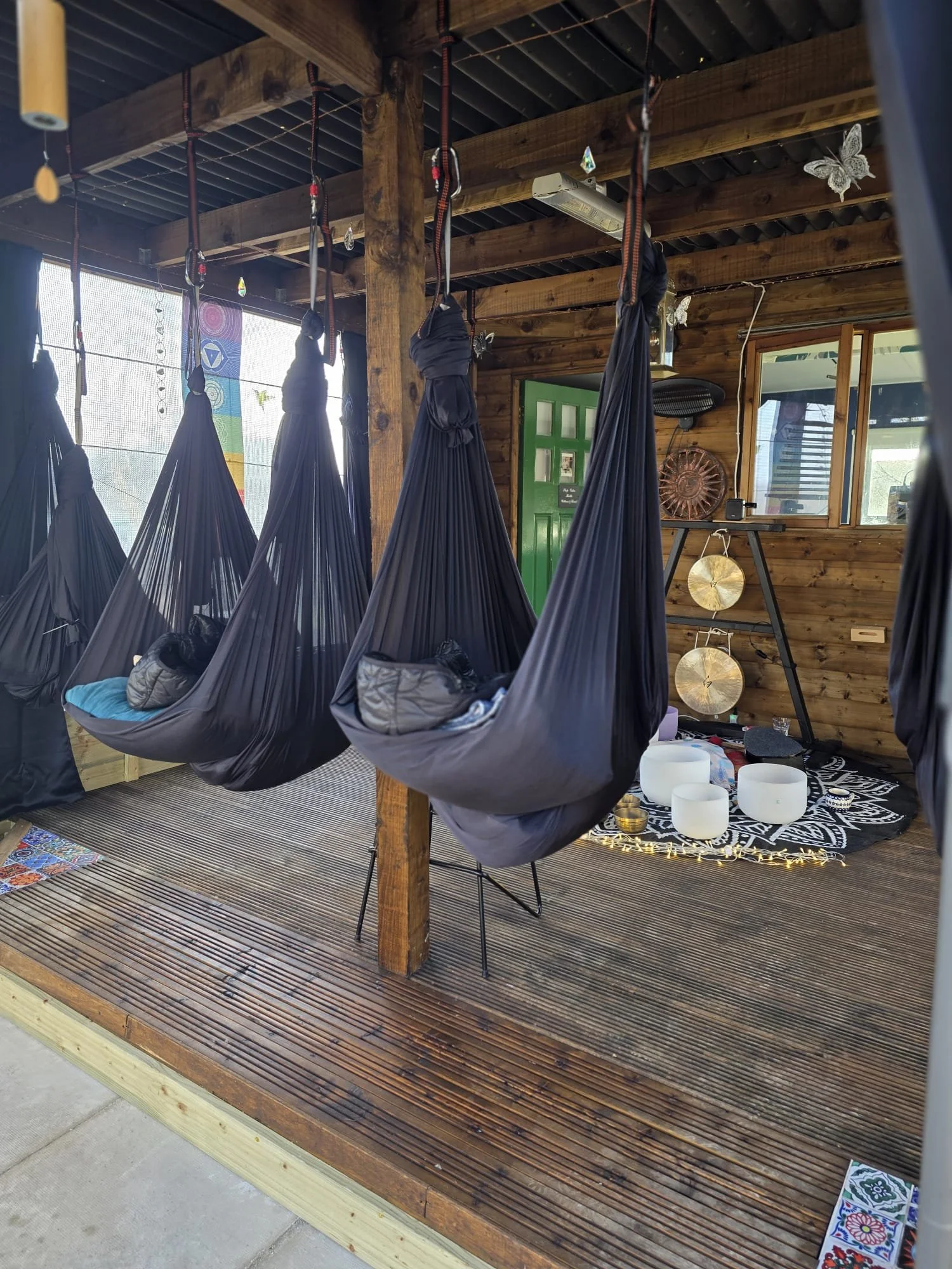 A custom built roofed wooden cabin, creates an intimate session with just 6 hammocks surrounding the healing bowls and instruments in the centre.